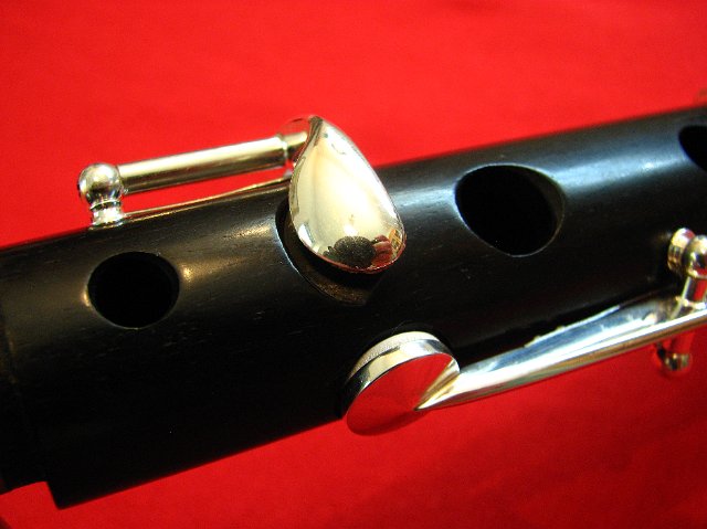 Close up of Short F-Natural Key with it's touchpiece recess in the timber of the mainbody, Long F-Natural key and notehole in front of it
